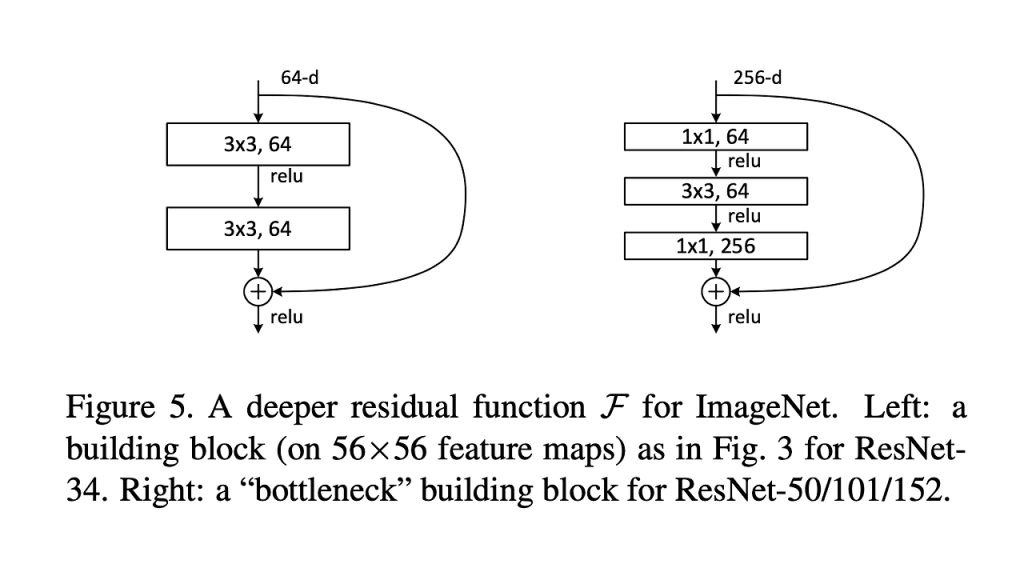 병목 블록은 채널을 $1/4$로 줄였다가($64$) 다시 늘립니다. ($256 \rightarrow 64 \rightarrow 64 \rightarrow 256$)